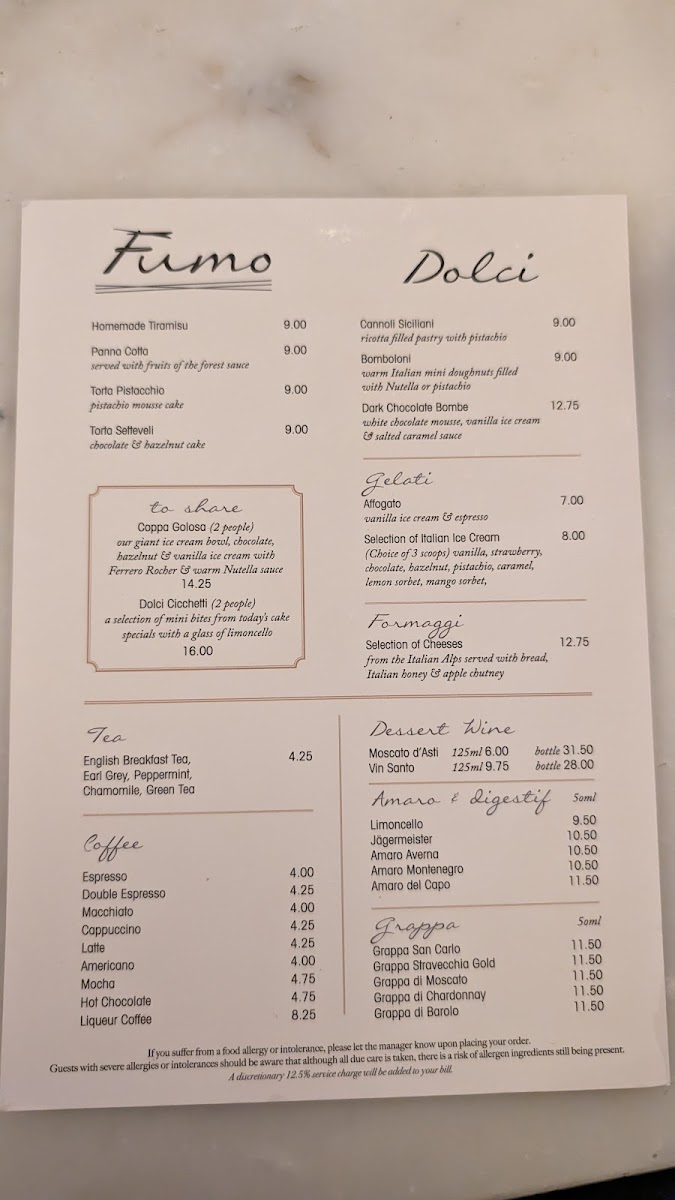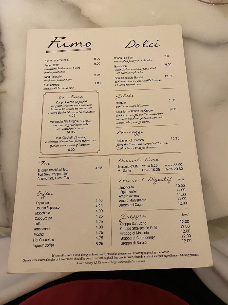 From a performance standpoint, service is consistently prompt and polished, and presentation is top-notch. The pricing is in line with other upscale Italian restaurants in central London, but the quality and ambiance justify the cost. For those seeking a luxurious yet authentic Italian meal in the West End, Fumo By San Carlo delivers an experience that feels both elevated and warmly inviting.