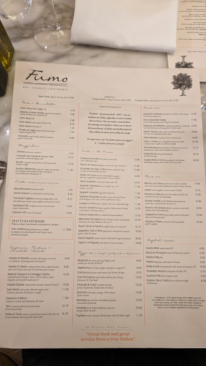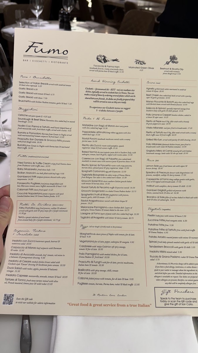 Fumo By San Carlo in London offers an exceptional Italian dining experience that beautifully marries sophistication with authentic flavours. Nestled in the heart of the city at 37 St Martin's Ln, this stylish venue is a favourite among both locals and international visitors for its chic interiors, excellent service, and dynamic culinary offerings. The Fumo By San Carlo - London Menu reflects a contemporary approach to traditional Italian cuisine, featuring a well-balanced selection of cicchetti (Italian small plates), pastas, seafood, and grilled meats.